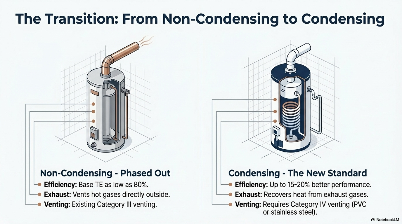 For building owners managing hotels, restaurants, multifamily housing, office towers, or hospitals—any facility with high hot water demands—these standards signal a shift toward more efficient, but potentially costlier, equipment. Non-condensing gas models (current TE as low as 80%) will no longer be produced post-2026, forcing a pivot to condensing units that recover heat from exhaust gases for up to 15-20% better performance.