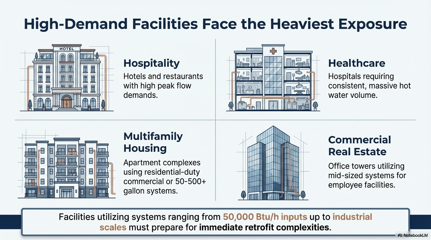 - Supply chain disruptions: Pre-2026 inventory will dwindle, limiting options for replacements in buildings with 50-500+ gallon systems common in mid-sized commercial properties.
