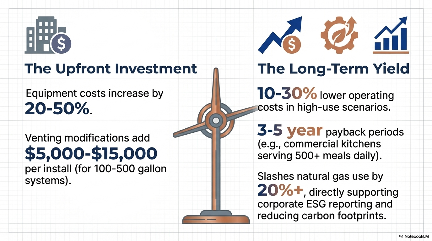 Beyond compliance, these standards align with rising energy costs and ESG goals. Condensing heaters slash natural gas use by 20%+, reducing carbon footprints for sustainability reports—vital for institutional investors in office or multifamily assets. Payback periods? Often 3-5 years in high-usage spots like commercial kitchens serving 500+ meals daily.