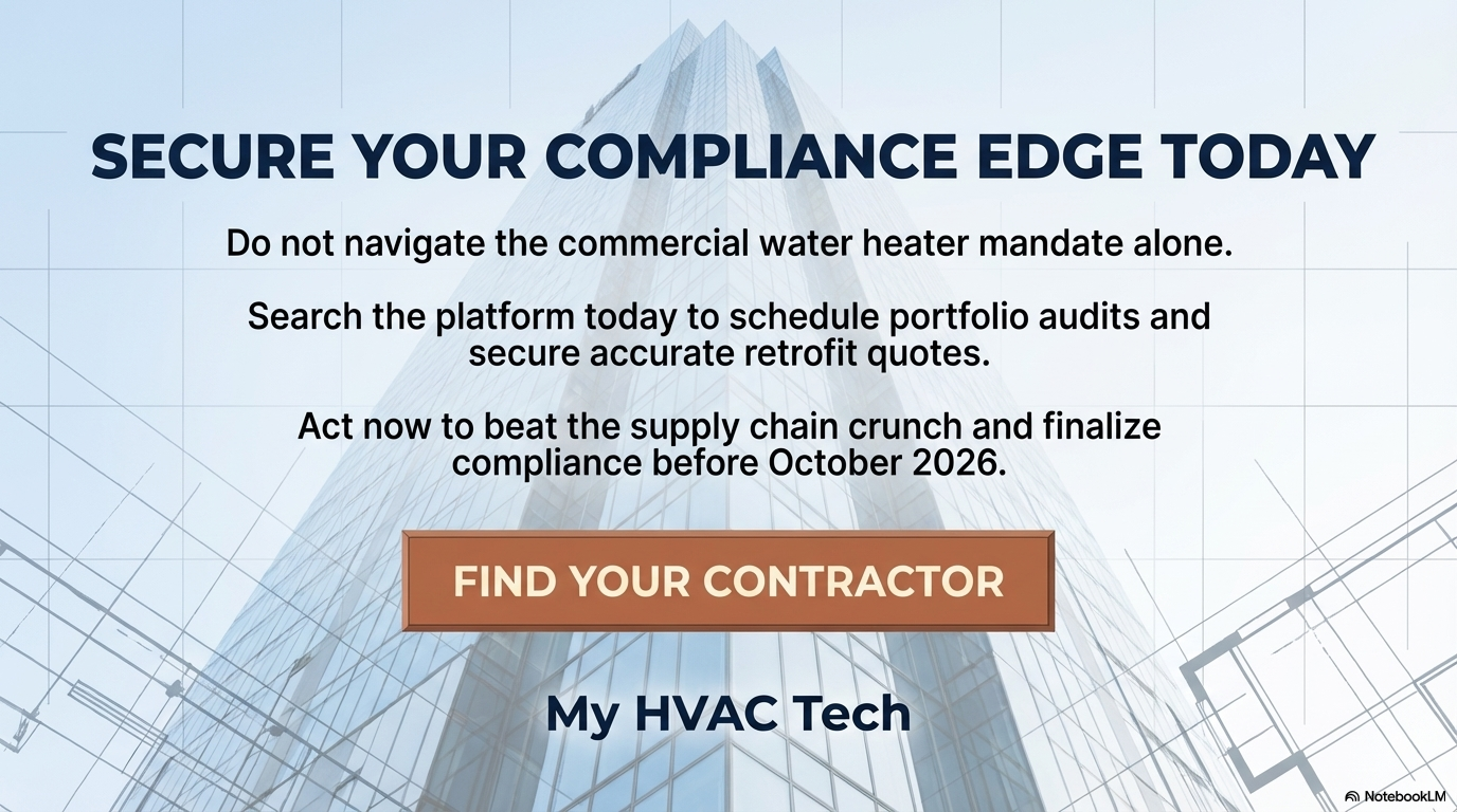Don't navigate this alone. Visit My HVAC Tech, the premier commercial HVAC marketplace for property and facility managers. Connect with pre-vetted contractors experienced in DOE-compliant water heater installs. Search now to schedule audits and quotes—secure your compliance edge before October 2026.