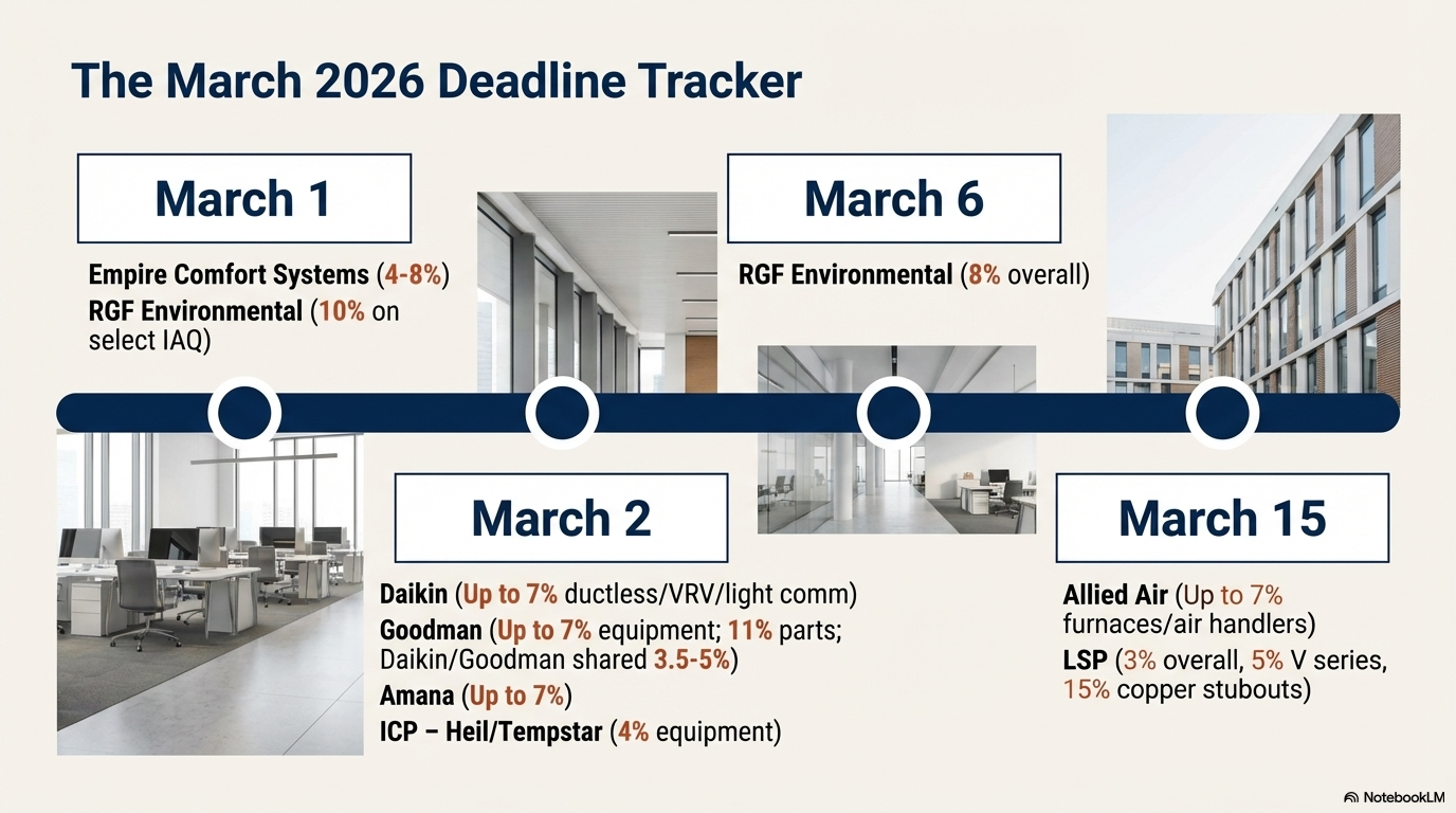 - Quote Early: Secure bids before March 2-15 effective dates. Lock in pricing for equipment like Goodman splits or Daikin ductless for Q2 projects.