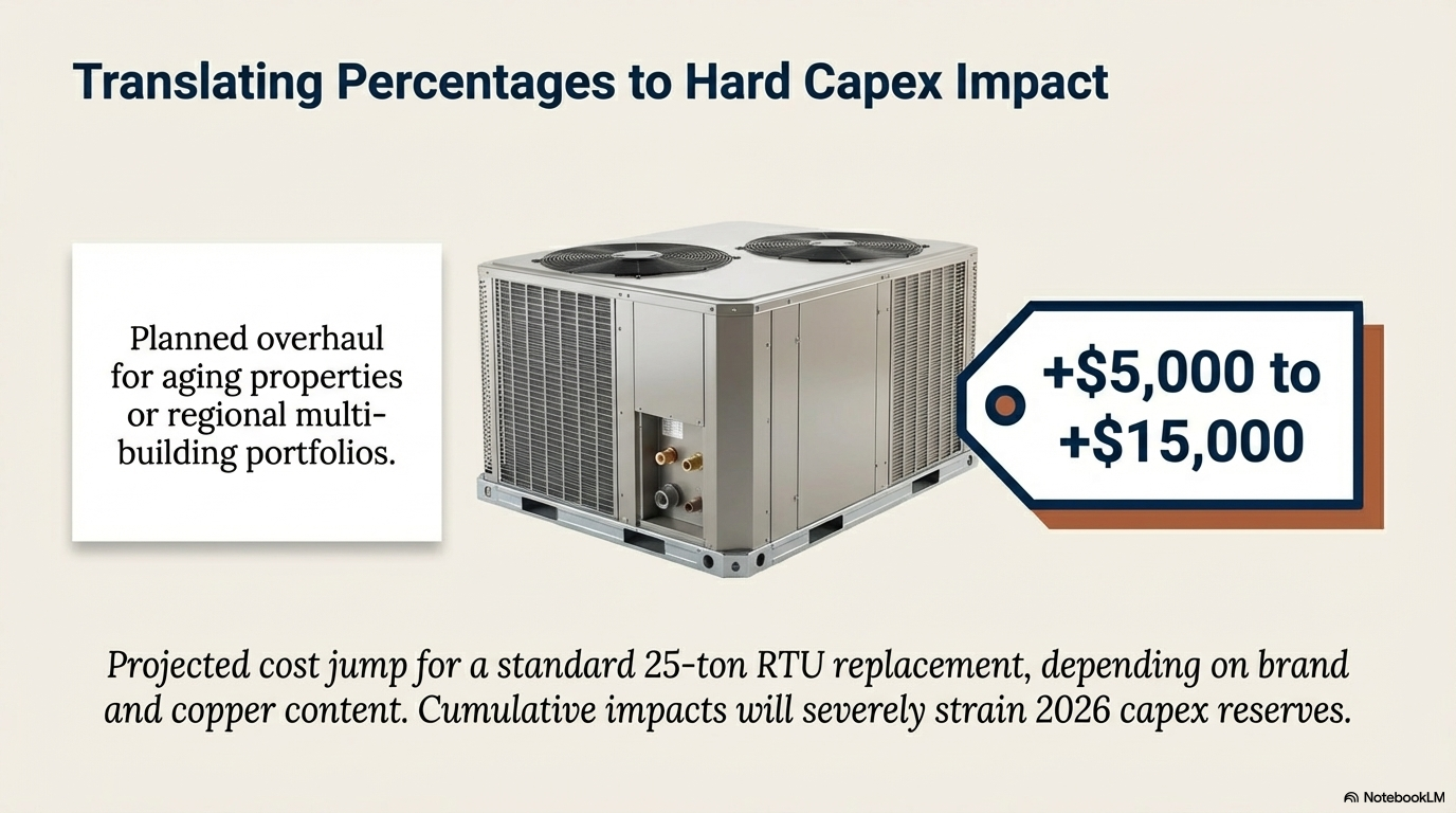 For facility managers budgeting for 2026, expect a 3-11% uplift on new installations or part replacements, compounding if you're planning major overhauls in aging properties. A 25-ton RTU replacement, for instance, could jump $5,000-$15,000 depending on the brand and copper content. In multi-building portfolios—think regional office parks or big-box retail—cumulative impacts could strain capex reserves.